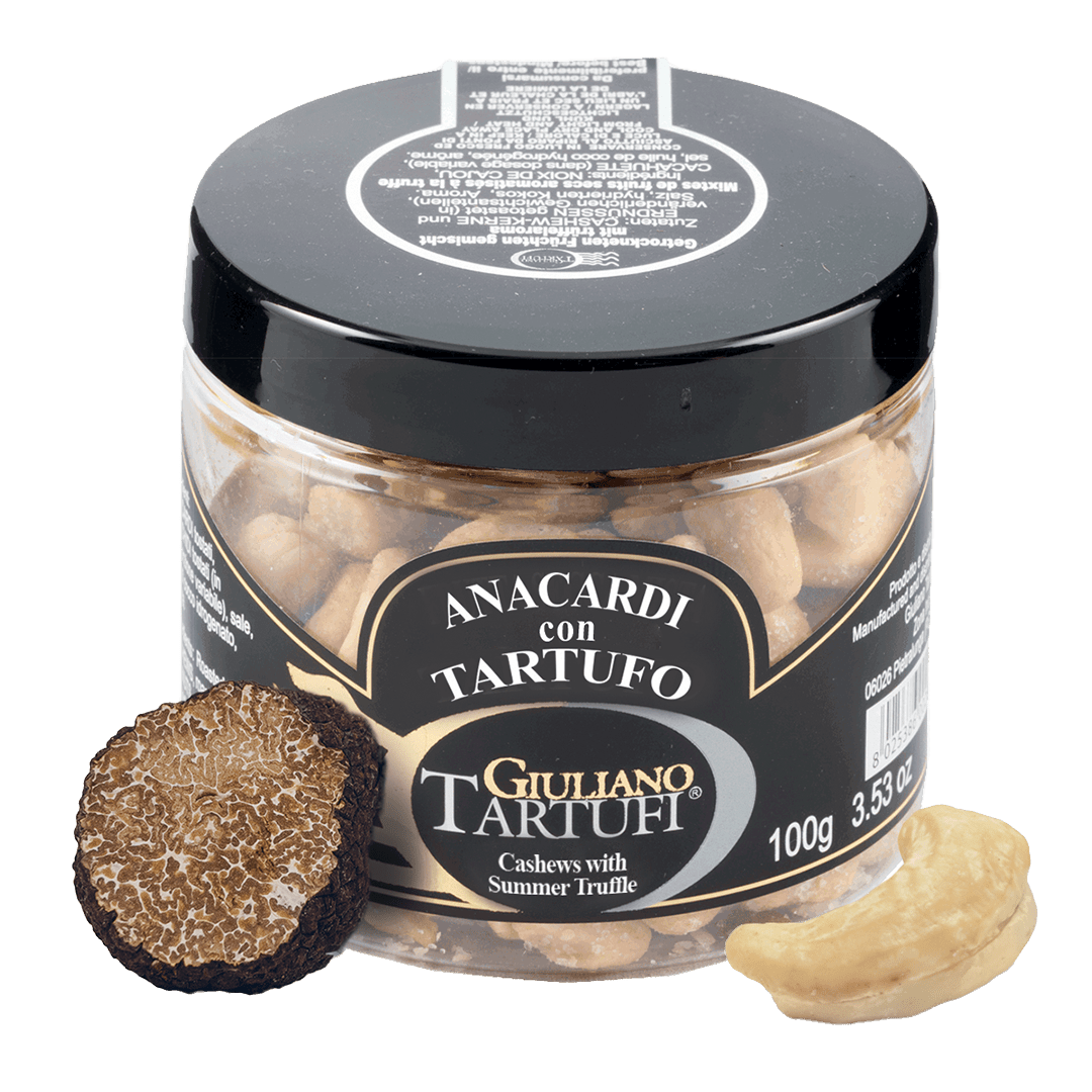 Cashew-Karne mit Sommertrüffel sind ein herzhafter Gourmet-Snack für jeden Anlass. Das sichtbare Vorhandensein von Sommertrüffelstücken erhöht sein Prestige.