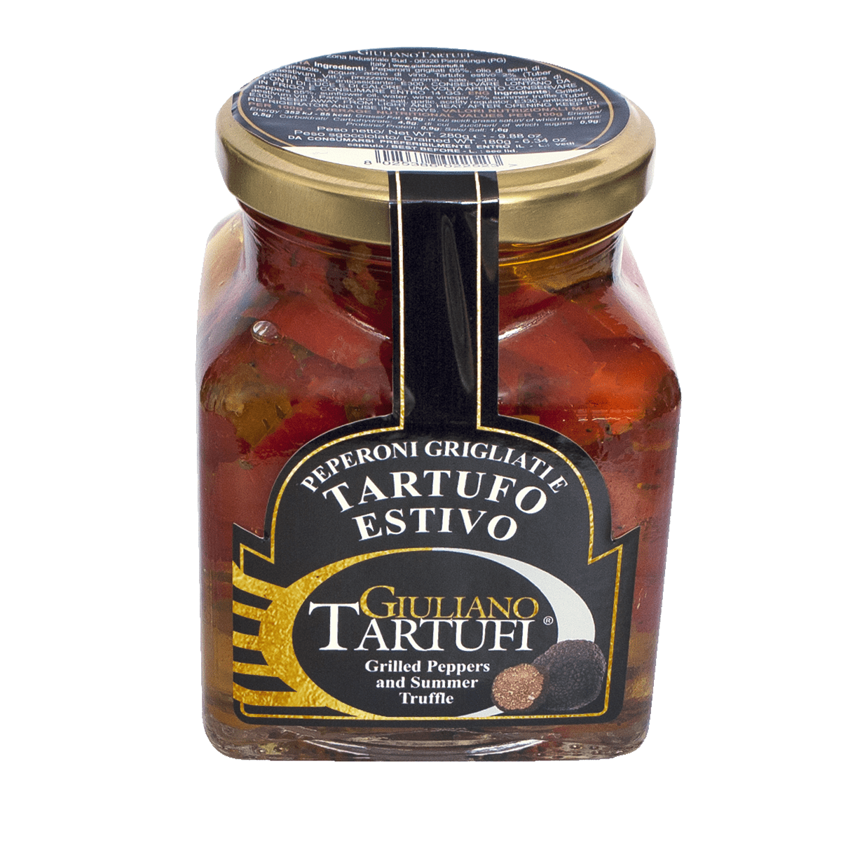 Reichhaltiges und köstliches Rezept, basierend auf sorgfältig ausgewählten fleischigen gelben und roten Peperoni, gegrillt und in Sonnenblumenöl gelegt. Ein typisch süßer und intensiver Sommergeschmack, der das ganze Jahr über erhältlich ist, wobei das Vorhandensein von Sommertrüffeln in Streifen den Unterschied ausmacht.