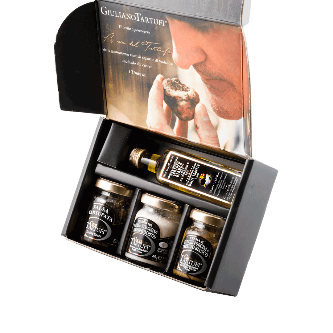 Chic and compact mini box, a perfect gift idea, containing 4 historical Giuliano Tartufi products in mini format: