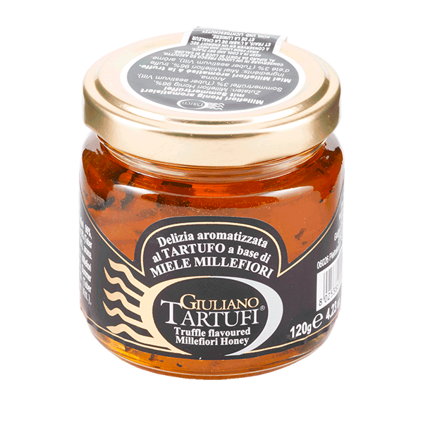 The Prized black truffle flavoured specialty based on Millefiori honey, with visible pieces of black truffle, is an original bouquet of truffle and honey with a fine granulation and a delicate flavour.