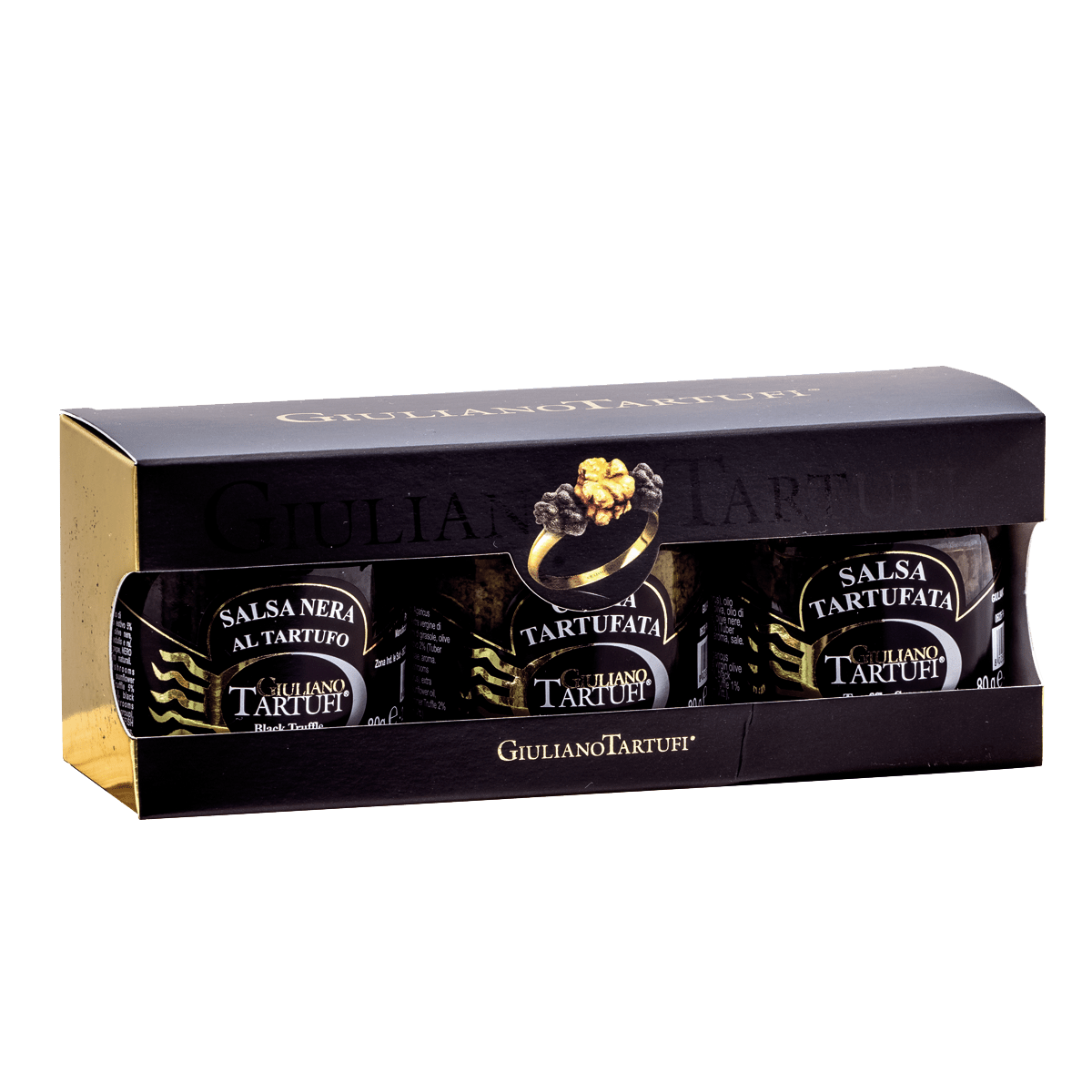Intéressant combo introduit récemment, à utiliser également comme idée cadeau, composé de 3 sauces à la truffe Giuliano Tartufi différentes au format 80 g: